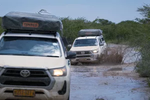 In der Trockenzeit sind die meisten Pisten staubig und gut befahrbar – perfekt, um Namibia stressfrei zu entdecken. Aber wenn die Regenzeit Einzug hält (vor allem in der oberen Höälfte Namibias rund um den Etosha National Park), kann es richtig spannend werden: Schotterpisten verwandeln sich in schlammige Abenteuerpisten, tiefe Pfützen fordern deinen Allradantrieb und dein Können – Fahrten werden schnell zur Challenge und einem noch aufregenderen Abenteuer. Uns macht es richtig Spaß – allerdings wird das Sichten von Tieren schwieriger. Und Achtung: Die Pfützen sind manchmal so tief, dass dein Nummernschild auf der Strecke bleibt. Also mit Vorsicht in Pfützen fahren oder Freunde vorfahren lassen.